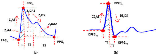 where Cw and Rp are the arterial compliance and peripheral vascular impedance, respectively. In Equation (1), the pulse wave and pulse differential wave have a relation to the blood flow. Therefore, in this study, we proposed that some parameters should be extracted from the pulse wave, as shown in Figure 2a, and also from the differential wave of the pulse, as shown in Figure 2b. Table 1 shows the parameter definitions.