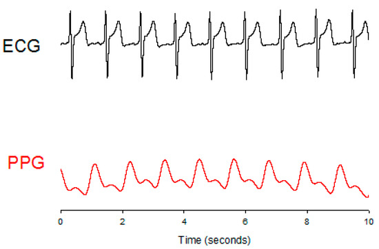The typical wave of electrocardiogram (ECG) and photoplethysmography (PPG).