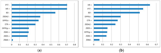 The correlation coefficient between pulse wave parameters and the blood pressure, (a) the systolic pressure, (b) the diastolic pressure.