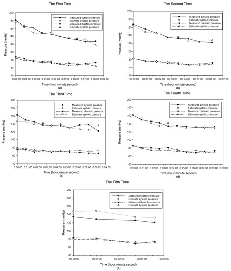 The measured and estimated blood pressures during five exercises for the fifth subject. (a) the first time experiment, (b) the second time experiment, (c) the third time experiment, (d) the fourth time experiment, (e) the fifth time experiment.
