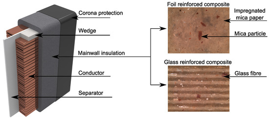 Another milestone in this area was the incorporation of mica paper as a part of the insulation system in the middle of the 20th century [9]. At that time, also a development, research and application grew in the field of impregnants. Previously used bituminous varnishes being slowly replaced by synthetic resins. The most common representatives for electrotechnical applications are polyester [10], epoxy [11] and in special cases silicone [12] resins. Also natural fibers have been replaced over the time. Glass fibers, polyethylene terephthalate or polyethylene naphthalate films [13] are used today as a reinforcement. These so-called “hard” insulation systems can be operated at higher temperatures and voltage levels. Their disadvantage may be the fact that they do not sufficiently fill the slot of the machine, which in some cases may lead to the formation of slot partial discharges. The illustration of the stator winding with composite insulation is shown in Figure 1.