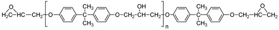 Industrial epoxy resin Epoxylite 3750 LV (produced by Elantas) has been selected as a suitable matrix. It is based on bisphenol-A epichlorohydrin, which are essential components for the polymerization of bisphenol-A diglycidyl ether (Figure 4). Epoxylite 3750 LV is used in industry due to its properties [29], such as low processing viscosity (in our case ensures better filler dispersion [28]) and high bond strength. It is used by manufacturers for the impregnation of windings of electrical machines by vacuum-pressure technology (VPI). Epoxylite 3750 LV is curable at elevated temperatures (140 °C, 4–6 h or 160 °C, 3–6 h) without additional hardener at it is free of additional solvents, which could negatively influence the interaction between matrix and filler, or reinforcement, respectively.