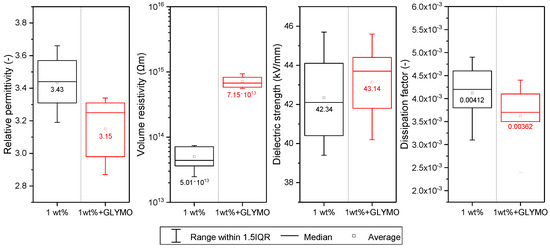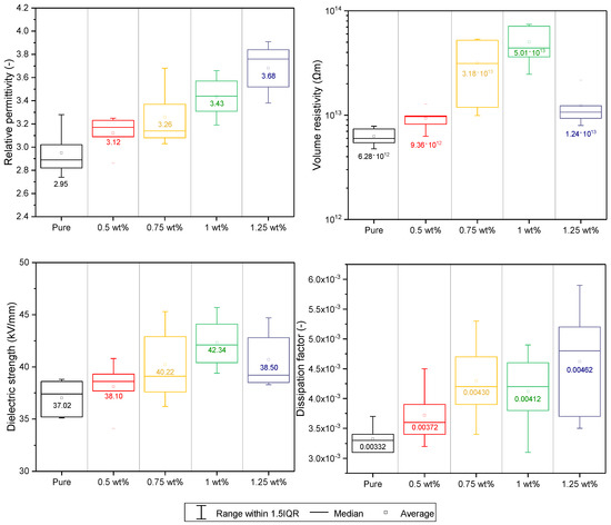 Taking into account the preliminary measurements of the main electrical properties, which are deeply described in [32], the optimum weight ratio was set to 1%. Especially due to the values of dielectric strength and volume resistivity. The box plots with marked average values of investigated parameters are shown in Figure 5.
