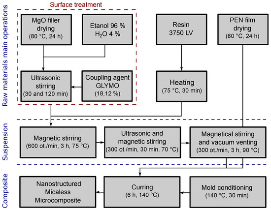 In the previous parts, individual components, dielectric properties and their application advantages were described. In this section, attention will be paid to the description of the production process of synthesized composite material. It can be divided into several phases, which are shown in block diagram in Figure 7.