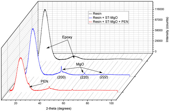 In general, particles or films often contain a significant amount of water molecules which are absorbed or weakly bonded in the volume. From this reason, it is necessary to start with the dehydration. Magnesium oxide powder placed in Petri dishes was dried in a hot air dryer together with sheets of polyethylene naphthalate film (80 °C, 24 h) to eliminate the effect of moisture. After that, the particles were added to a solution of 96% ethanol 4% H2O (10 mL) and ultrasonic stirred (20 kHz, 30 min). The surface functionalization process follows with addition of GLYMO modifier (18.12%) to the mixture with re-application of ultrasonic stirring (20 kHz, 2 h). Meanwhile, the epoxy resin was heated to a temperature of 75 °C, which resulted in a lower viscosity for subsequent processing. The surface-treated (ST) nanoparticles were then added to the already heated epoxy resin and subsequently magnetically stirred (600 rpm, 3 h, 75 °C). Last but one step was combined ultrasonic and magnetical stirring (300 rpm, 20 kHz, 30 min, 70 °C). Finally, vacuum venting was performed with reduced magnetic stirring (300 rpm, 3 h, 90 °C). The elevated temperature of 90 °C provided evaporation of the ethanol from the epoxy mixture. The resultant mixture was then applied to preheated Teflon molds with a silicone spacer and a PEN reinforcing component. Preheating of Teflon molds eliminates the effect of their surface moisture and ensures better adhesion of the silicone spacer. Considerable attention has been also paid during production to ensuring the homogeneity of the internal structure of the sample by removing the resulting air bubbles. The prepared samples have been cured in a hot air dryer (140 °C, 6 h).