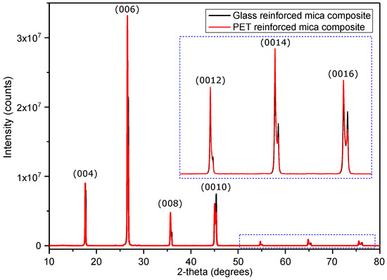 The attention has been also paid to the analysis of commonly used insulation materials. There are visible peaks of used filler, which corresponds to Muscovite 6-263(2M1) whose has been investigated e.g., in [48]. Unfortunately, due to the majority share of mica paper in composite and its intensity, it is not possible to define other elements using this technique. However, slight differences between glass reinforced composite and PET reinforced composite are visible in Figure 9.