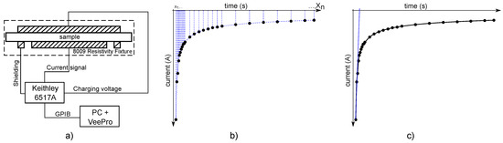 The electrometer Keithley 6517A (Keithley Instruments) with 8009 Resistivity Fixture (Keithley Instruments) electrode system were used for this measurement (schematicaly in Figure 10a). The measurement starts with the charging (3600 s) and after that, the dielectric resorption current was measured from 0 to 300 s. For better comparison between individual composite materials, both parameters have been determined at the applied intensity of electric field 1 kV/mm. In the following text, the main ideas of above-mentioned techniques will be described.