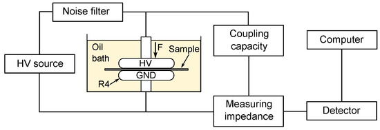 The experimental measurement was carried out using a galvanic measurement method in accordance with IEC EN 60270 standard [54] with a parallel measuring impedance (Figure 11). The measured samples have been immersed in an oil bath for the elimination of surface discharges which could overlap the internal discharge activity [55,56]. High voltage source 200 kV (High Volt), coupling capacity 1000 pF ± 10% (Maxwell Technologies), measuring impedance LDM-5 U 50 (LDIC), measuring and evaluation device PD Smart (Doble Lemke), pulse calibrator LDC-5/S3 (LDIC) and electrode with rounded edge limiting the effect of corona discharges have been used for this investigation. For better comparison, the inception voltage was replaced by the inception level (kV/mm). Values of charge Qiec (pC) have been determined at the inception level after 60 s. Following the results of the measurements, the comparison at the level 18.5 kV/mm has been performed.