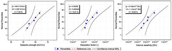 The key dielectric parameters have been investigated according to the above-mentioned standards and test conditions (Table 1) at Standard conditions B given by IEC 60212:2010. From the probability plots (Figure 12) is visible that the measured values show a low level of variability. There are also noted major statistical parameters, like average value (), standard deviation () and coefficient of variation ().