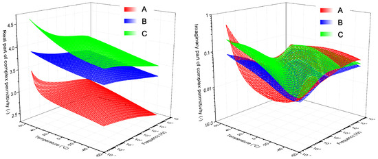 If the attention is focused on the dielectric processes it is very difficult to precisely define the individual polarizations which are visible in the imaginary part of the complex permittivity, because there is a combination of thermoplastic reinforcement with a thermosetting resin. However, these polarizations are probably caused due to the local motion of small molecular units, side chains and aromatic substitution groups, which contribute slightly to the dielectric losses [63,64] or due to the Brownian motion of the chain segments [65] in the case of higher temperatures. In the case of a loss factor, it is visible that the surfaces of investigated materials overlap to a large extent.