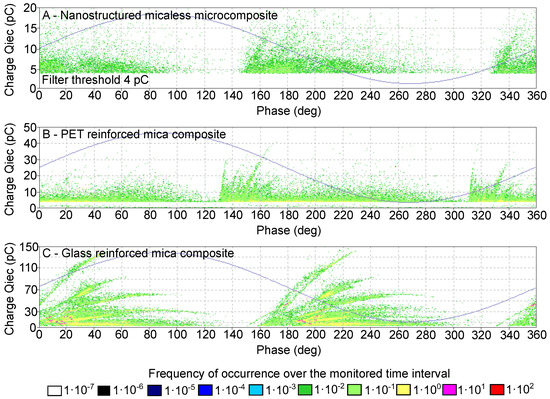 Selected PRPD diagrams for investigated composites on 18.5 kV/mm level.