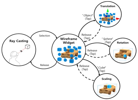 27]. Before translating or rotating a virtual object, a user must select it. We first select a virtual object using ray casting, and then, design two interaction methods; we describe these procedures in detail in the followings section.