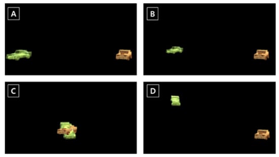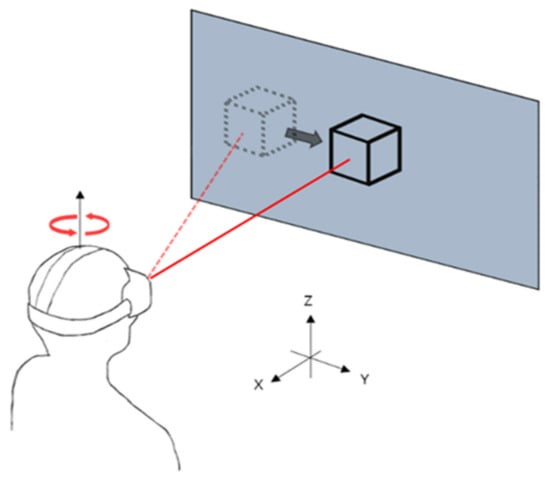 43]. Although we used only the head rotation of one axis to rotate the virtual object in Head Interaction, we used the head rotation of the yaw and pitch axes simultaneously to translate the virtual object in Head Interaction. AR is a technology that visualizes a virtual object in a real physical environment, so the background does not rotate dramatically. Therefore, even if the user’s head is rotated (slowly) around the yaw and pitch axes in AR, it does not cause serious dizziness to the user because the surrounding background does not change dramatically.