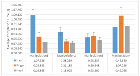 As a result of the post-hoc test conducted using Bonferroni correction, in Manipulation 1, the completion time of Hand Interaction (M 1 min 08 s) was longer than those of Finger Interaction (M 30 s, p < 0.001) and Head Interaction (M 20 s, p < 0.001). In addition, the post-hoc test revealed that the completion time of Finger Interaction (M 30 s) was more than that of Head Interaction (M 20 s, p < 0.017).