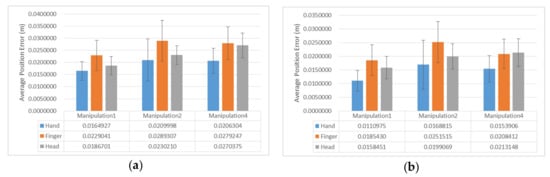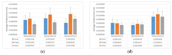 Figure 7 illustrates the graph of position error for each task, except Manipulation 3. Manipulation 3 did not calculate the position error because it was the task to only rotate the virtual object. The position error for each task did not find a statistically significant difference.