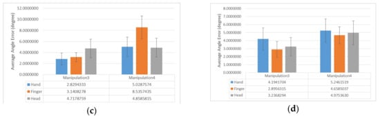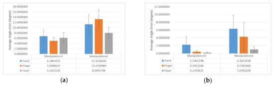 In addition, we analyzed the angle error of each axis. In Manipulation 3, the average angle error for each interaction was not statistically significant. However, in Manipulation 4, the average of angle error about the x-axis ((2) = 13.059, p = 0.001) and y-axis ((2) = 6.778, p = 0.034) for each interaction was statistically significant.