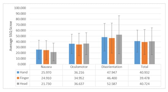 SSQ showed no significant difference in the total SSQ score and three scores for nausea, oculomotor symptoms, and disorientation. Rebenitsch et al. found that the simultaneous pitch- and roll-axis rotations caused higher dizziness to the user than one-axis rotation in the virtual environment [