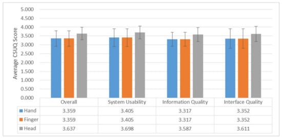 Although the results of the CSUQ score showed that there is no significant difference among the three interaction methods, the results of CSUQ for the three interaction methods were positive for all four aspects: System Usefulness, Information Quality, Interface Quality, and Overall. In addition, Head Interaction got the highest average of the CSUQ score among the three interaction methods.
