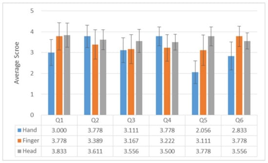The angle error of the y-axis for Finger Interaction (M = 8.585°) was statistically significantly greater than those for Hand Interaction (M = 5.028°, Z = −2.156, p = 0.031) and Head Interaction (M = 4.858°, Z = −2.548, p = 0.011). However, there was no statistically significant difference between Head Interaction and Finger Interaction. On the other hand, the angle error of the x-axis for Head Interaction (M = 1.039°) was statistically significantly less than those for Finger Interaction (M = 4.278°, Z = –1.977, p = 0.048) and Hand Interaction (M = 6.362°, Z = −3.593, p < 0.001).