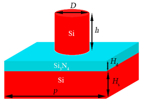 The designed unit cell of the all-dielectric nanostructure consists of a silicon nanodisk and a silicon substrate separated by a Si3N4 dielectric layer, as shown in Figure 1. D denotes the diameter of the nanodisk with height h. Hd is the height of the Si3N4 dielectric layer, and Hs is the height of the silicon substrate. p denotes the period of the unit cell. The central axis of the nanodisk coincides exactly with the central axis of the dielectric layer.