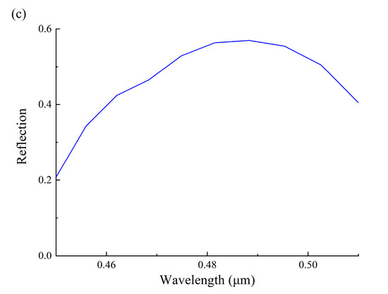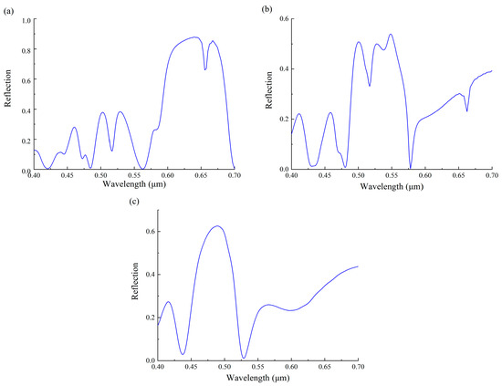 In this section, we used silicon nanodisks to realize the display of the letter T in different colors. From the results in Section 3, we know that the diameter of the nanodisk has a great influence on the hue of the structural color, while the height of the nanodisk, the thicknesses of dielectric layer and substrate mainly affect the saturation of the structural color. Therefore, the letter T with different colors can be obtained by only changing the diameter of nanodisk D and keeping the height of nanodisk and the thicknesses of the dielectric layer and the substrate at their optimal values (130 nm, 70 nm and 140 nm, respectively). Here, the letter T consisted of 6300 nanostructure unit cells and every nanostructure unit cell is the same as the one shown in Figure 1. The horizontal part of the letter T was made up of 50 rows × 75 columns of nanodisks, and the vertical part of the letter T consisted of 50 rows × 51 columns of nanodisks. We set the diameter of every nanodisk at 190 nm, the gap size between nanodisks to be 100 nm, and obtained a red letter T. A part of the corresponding red reflection spectra is shown in Figure 9a. By adjusting the diameter of the nanodisk to 115 nm and the gap size between nanodisks to 175 nm, we obtained a green letter T. A part of the green reflection spectra is shown in Figure 9b. By adjusting the diameter of the nanodisk to 100 nm and the gap size between nanodisks to 90 nm, the blue letter T was obtained. A part of the blue reflection spectra is shown in Figure 9c. In the above simulations, the boundary conditions in x and y directions are periodic, and in the z directions are PML.