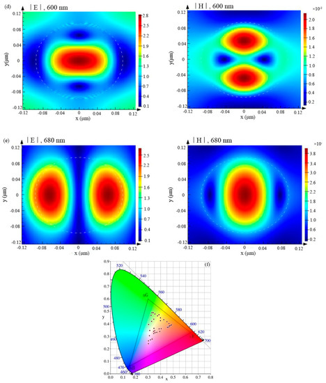 where , , are the matching functions. Then, we can obtain the chromaticity coordinates (x, y) by and . The corresponding chromaticity coordinates in the International Commission on Illumination’s (CIE) 1931 chromaticity diagram based on the measured reflectance spectra from simulations are shown in Figure 2f. On the one hand, the resonances are not equally excited under the different parameters of the nanostructure. On the other hand, the absorption of silicon to blue light is more intense from the trend of the permittivity of silicon with wavelength. Hence, we can find that the blue is weaker than red and green from the chromaticity diagram. Even so, we think that rich colors can be obtained by improving the parameters of nanostructures, and this can be potentially used for colorful display.