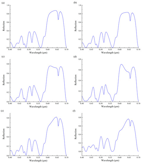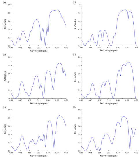The reflection spectra of different Hs. (a) The reflection spectra with Hs = 100 nm. (b) The reflection spectra with Hs = 140 nm. (c) The reflection spectra with Hs = 170 nm. (d) The reflection spectra with Hs = 230 nm. (e) The reflection spectra with Hs = 270 nm. (f) The reflection spectra with Hs = 300 nm.