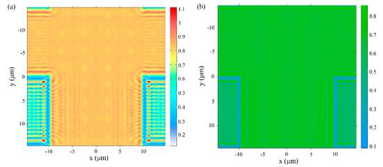 To understand the resonant modes inside the nanostructures, we take the structure with D = 190 nm and p = 290 nm as an example. The corresponding electric dipole (ED) and magnetic dipole (MD) resonances are shown in Figure 2d,e, respectively. It can be seen clearly from Figure 2 that magnetic resonance and electric resonance coexist, but the electric resonance shows higher intensity. The electric dipole and magnetic dipole resonances play an important role in increasing the absorption of light and enhancing the transmission efficiencies [21,22,23].