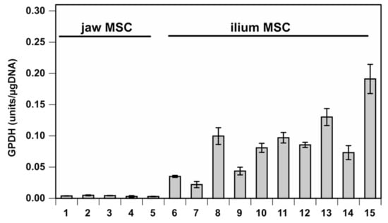 Adipogenic differentiation levels of bone marrow mesenchymal stromal cells (MSCs) evaluated by glycerol-3-phosphate dehydrogenase (GPDH) activity at 28 days after adipogenic induction. The activity was normalized using genomic DNA content to show means ± standard error (n = 3). 1–15, donor ID numbers; 1–5, jaw MSCs; 6–15, ilium MSCs.