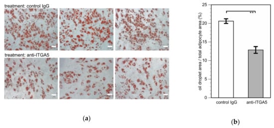 Effects of the anti-ITGA5 antibody on adipogenic differentiation of ilium MSCs. (a) MSCs were treated with the anti-ITGA5 or control IgG for 21 days during adipogenic induction and stained with oil red O (scale bar, 70 μm). (b) Oil droplet area was quantified by using ImageJ software. Data are presented as mean percent area ± standard error (n = 3). Student’s t-test, ** p < 0.01.