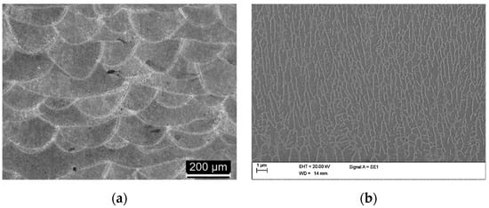 Cross-sections perpendicular to the vertical building direction are shown in Figure 2 at low and high magnifications. Macroscopically, the samples put in evidence the layer-by-layer building strategy, which is typical of the SLM process. They are constituted of overlapping melt pools, which appear half-cylindrical in shape and comprise an internal fine fusion zone and an outer coarser heat-affected zone. Moreover, two types of defects, which are known to be possible crack-initiation sites [20], are visible in the reported micrograph; a lack-of-fusion defect, originating from insufficient melting of powder, in the center of the picture and a spherical pore, due to vaporization induced by excessive heating, in the lower part of the image. In Figure 2b (higher magnification), the supersaturated aluminum matrix appears to be surrounded by an almost continuous eutectic Si network [15], which is elongated along the building direction due to the parallel thermal gradient [33,34].