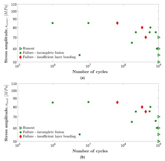 In Figure 3, the S-N plot of the experimental data is shown. In Figure 3a, , with respect to the number of cycles to failure, , is shown; in Figure 3b, , with respect to the number of cycles to failure, is shown. Two markers are used to differentiate between the defects originating the fatigue failure (the defect was due to incomplete fusion and insufficient layer bonding, according to Section 3.3).