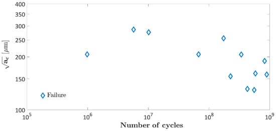 According to Figure 6, decreases with the . Except for one data (, ), the scatter associated to the reduced, with respect to the S-N plot shown in Figure 3, thus confirming that the defect size controls the VHCF response. The deviation of the datapoint (, ) could be due to a local variation of the microhardness (Section 3.1). The defect size range is close to the range found for SLM AlSi10Mg specimens [20] horizontally built. In particular, is smaller than in 9 out of 12 defects (), whereas it is larger than in 3 out of 12 defects ().