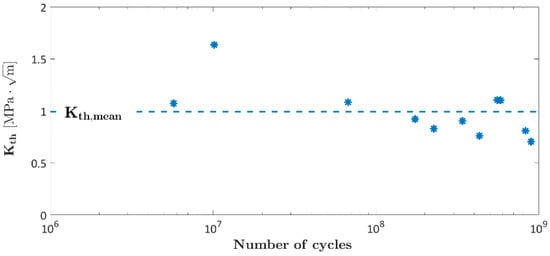 In order to investigate the influence of defects on the VHCF response, the stress intensity factor threshold (SIF threshold, ) is also analysed. According to [21], for failures in the VHCF region, the SIF associated with the defect must be equal to the SIF threshold. The onset of the VHCF regime is assumed to be equal to cycles [21]. Therefore, only specimens which failed above cycles were considered for computing the SIF threshold. Figure 7 plots the SIF threshold, with respect to the number of cycles to failure, together with the mean SIF threshold, .