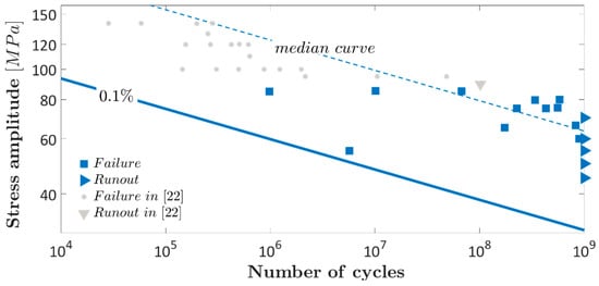 Figure 8 shows the S-N plot of the experimental data, together with the estimated median and 0.1% (99% reliability) P-S-N curves. The VHCF response obtained in [22] by testing hourglass specimens with similar process parameters (batch B) is also shown in Figure 8 (light grey markers).