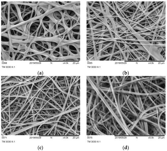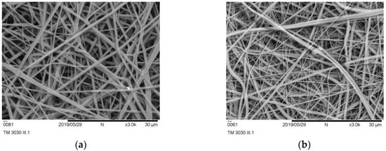 In the beginning, it was necessary to confirm the fiber morphology of pure polymers, so PLA- and PVP-based nonwovens were examined by SEM (Figure 1), and after that samples with active compounds were prepared.