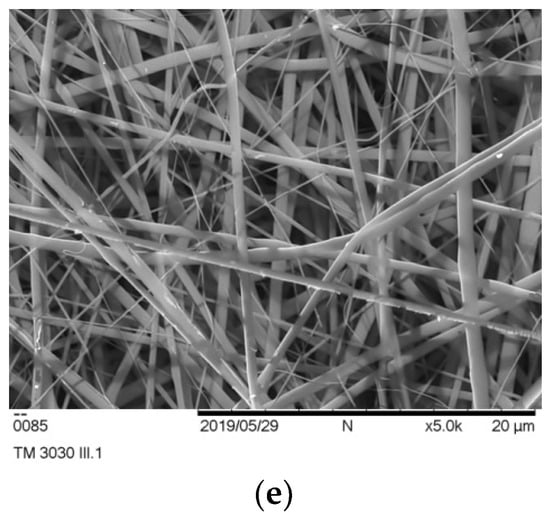 SEM images of composite nanofibers. (a) PLA + 10 wt% pomegranate seed oil, (b) PLA + 5 wt% sea-buckthorn oil, (c) PVP + 10 wt% sea-buckthorn, (d) PVP + 5 wt% pomegranate seed oil and (e) PVP + 10 wt% of mixture of pomegranate seed oil and extract of fermented pomegranate juice (1:1).