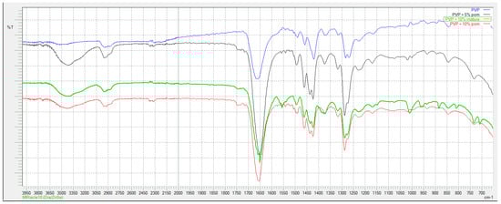 In Figure 3. where spectra for PVP-based series are shown, typical peaks for PVP are present in all curves: wide peak at 3434 cm−1 originates from O-H stretching vibration, small peak at 2955 cm−1 is derived from C-H asymmetric stretching vibration, sharp peak at 1661 cm−1 corresponds to C = O stretching vibrations. Peak at 1424 cm−1 is from CH2 bending vibration and peak at 1290 cm−1 corresponds to C-N vibrations.
