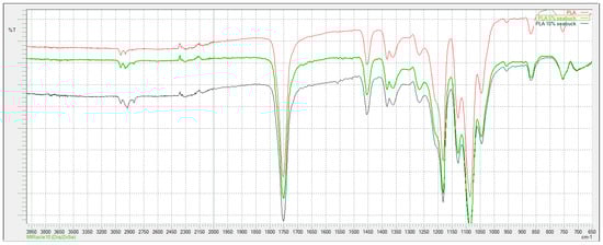 When comparing spectra of pure and composite PLA fibers, it can be seen that there is no difference between them (Figure 4). Typical peaks for PLA are present, at 2997 and 2945 cm−1 is peak from C-H stretching, C=O stretching peak is a sharp peak at 1746 cm−1, C-H bending vibrations are presented with peaks at 1452 and 1365 cm−1, while C-O stretching derived peaks at 1180 and 1080 cm−1.