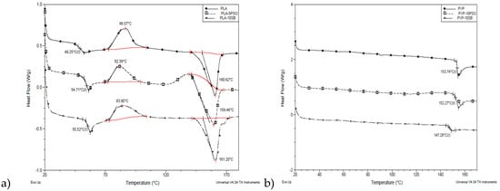 DSC thermograms of (a) PLA-based and (b) PVP-based series of samples.