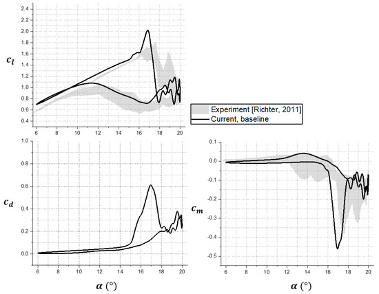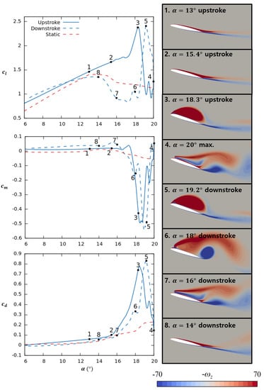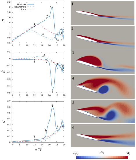 The current RANS simulation is able to capture major features observed in the wind tunnel experiment of Richter et al. [38] (see Figure 13). The shaded area indicates the range of the experimental data points [38]. This clearly shows that the dynamic stall in the experiment is not same every pitch cycle. It can be conjectured that the nature of the flow separation associated with the stall and, as a consequence, massively separated flow is highly sensitive to environment and detailed experimental conditions. Nonetheless, the overall aspect of the deep dynamic stall is acceptably reproduced in the current simulation. The moment stall around and the lift stall around are captured in the simulation. The magnitude of the peak moment and the peak lift are slightly over-estimated in the simulation. In the upstroke, the current simulation predicts higher , compared to the test, which is presumably related to the deviation of the experimental data from the theoretical lift slope for the static airfoil (see Figure 3). No drag data is reported from the wind tunnel experiment.