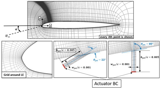 O-type grids are generated around the current OA209 airfoil. According to the previous study [46], the leading edge separation occurs on the OA209 airfoil. Thus, dense grids are generated near the leading edge. Structured grids for the current simulation are created to capture the boundary layer on the OA209 airfoil. The first wall-normal grid point is located at in wall units. Grids for the clean airfoil are generated first, then a slot for the jet actuation is introduced on the clean airfoil grid. The current grid of is used for the clean airfoil. The streamwise grid size at the leading edge is . For the airfoil with the chord-normal slot = 80°, grids are used (see Figure 2). For the airfoil with the tangential slot = 22°, grids are used. Slightly more grids on the OA209 airfoil with the tangential slot are used to resolve the interaction between the jet and the boundary layer downstream of the jet exit, compared to the chord-normal slot. For the chord-normal and the tangential slot, and grids are used, respectively. The asymmetric sides of the tangential slot require more grids inside the slot for capturing flow phenomena on the corner between the suction side and the slot end, compared to the chord-normal slot.