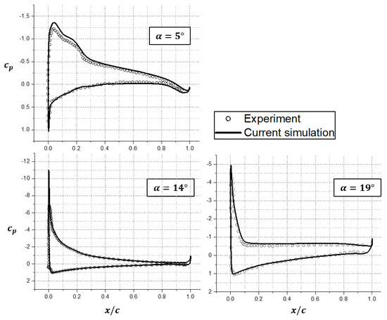 Pressure profiles between the test and the current computations are compared, as shown in Figure 4. The current pressure profiles at and 19° are agreed well to the available test data. The current simulation slightly overestimate the suction peak, resulting in a slightly higher lift in the linear slop region in Figure 3. Based on 3D simulation of Richter et al. [37], the wind tunnel experiments [36] involve small, but non-negligible 3D efforts primarily due to a tip flow near side walls, which slightly reduces the lift compared to the 2D case.