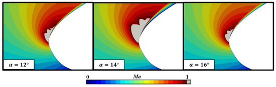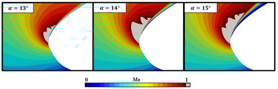 Similar to the static baseline, a supersonic pocket is observed in this pitching conditions (see Figure 14). The supersonic region already forms at the mean angle, continuously grows till . Once the DSV separates from the airfoil, the supersonic pocket disappears.