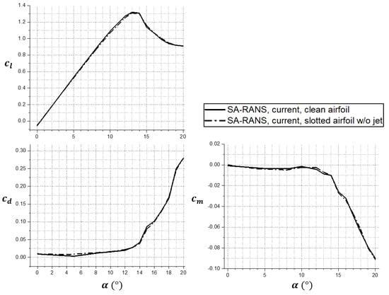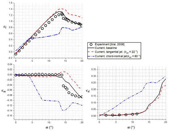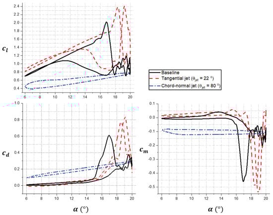 The current slot width yields a negligible impact on the aerodynamic loading without jet actuation, as shown in Figure 6. The open outlet on the suction side is about and for the chord-normal and the tangential slot, respectively. Since the larger outlet with the tangential slot does not change significantly the baseline aerodynamics, the impact of the chord-normal slot by itself on the baseline would be much smaller.