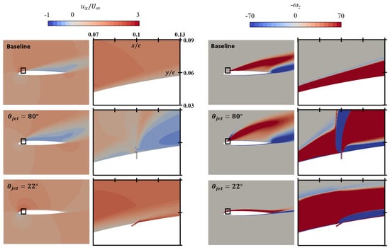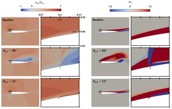 Flow fields of around the OA209 airfoil at and 17° are shown in Figure 8 and Figure 9, respectively. The velocity in the chord-wise direction and the spanwise vorticity are used for the visualization. Please note that is close to the maximum lift angle in both the simulation and the test (see Figure 3). The overall baseline flow is attached on the airfoil at with a noticeable shallow separation near the trailing edge. The external flow is significantly deteriorated with the chord-normal jet which penetrates the boundary layer, forming a virtual wall. In contrast, the tangential jet remains successfully in the boundary layer. It can be expected that an additional momentum is provided directly into the boundary layer when the jet is ejected at an angle close to the direction of the flow. The vorticity field indicates that the tangential jet resides in the boundary layer with a minimum impact on the boundary layer thickness.