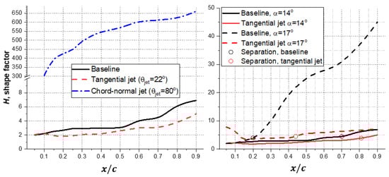 The gain in the flow momentum due to the jet can be diagnosed with the shape factor H of the suction-side boundary layer. The shape factor is the ratio between the displacement thickness and the momentum thickness in the boundary layer, i.e., . A small value of H indicates that the momentum of the boundary layer is high enough to withstand an adverse pressure gradient. As shown in Figure 10, the value of H for the chord-normal jet case is over 300 at . In contrast, H for the tangential jet case is even lower than the baseline without flow control. Thus, the tangential jet can help to avoid the separation by providing additional momentum into the boundary layer directly. At , the OA209 airfoil is completely stalled with the separation point at . The tangential jet delays the separation to the mid-chord point, significantly reducing the value of the shape factor, i.e., adding the momentum into the boundary layer without a significant increase in the thickness. The suction side is prone to separation when the shape factor is about 4 in the current simulation.