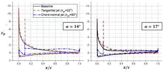 Pressure profiles are shown in Figure 11 for the two angles and 15°. At which is 3° higher than the baseline stall angle, the tangential jet reduces the suction pressure in the first half of the suction side, increasing the lift by (see Figure 7). The augmentation of the lift in the first half is related to the pitch-up moment which is observed in Figure 7. The chord-normal jet impairs the suction pressure, losing the aerodynamic lift for an angle .