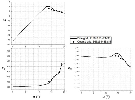 Since the small outlet of the slot on the suction side does not significantly change the baseline aerodynamics, the two distinct grids (one for the clean airfoil and the other for the slotted airfoil) can be used to check the sensitivity of the current computation to the spatial resolution. The slotted airfoil grid of (external flow part) includes much finer grids in the streamwise direction on the suction side, compared to the clean airfoil grid of . The boundary layer separates near the refined region downstream of the jet outlet at angles slightly beyond the stall angle. Figure 6 indicates that the current clean airfoil grid is fine enough for this stall simulation. This is expected because very similar grids have shown well-converged results with respect to the spatial resolution in aeronautic stall computations using second-order-accurate flow solvers [21,23,47].