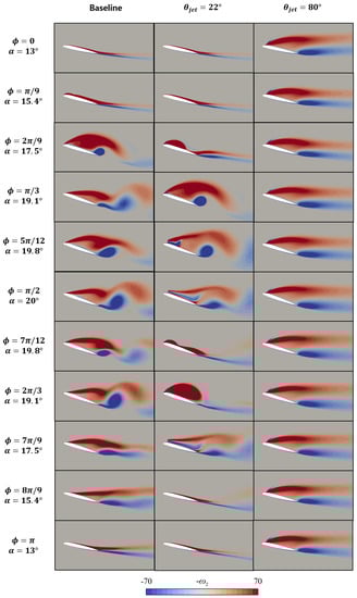 The evolution of the vorticity around the pitching OA209 airfoil is compared, as shown in Figure 16. The zero phase corresponds to the mid-upstroke angle . The onset of DSV due to the leading edge separation is visible at in the upstroke of the baseline. The tangential jet delays the DSV onset which occurs around when the DSV in the baseline is being detached from the airfoil. The DSV in the case of the tangential jet separates from the airfoil after in the upstroke. Around the peak angle , the tangential jet is dynamically interacted with stall vortices. For example, at , the tangential jet penetrates deeply the re-circulation region. It is interesting to notice the similar presence of the jet in the massively separated region at both the peak and the downstroke angle . The interaction between the tangential jet and the separating flow may induce the formation of the secondary DSV at in the downstroke. The maximum size and the strength of the secondary DSV are anticipated to be similar to those of the initial DSV, based on the secondary moment and lift stalls in the case of the tangential jet (see Figure 15). The tangential jet helps the external flow to reattach on the airfoil around in the downstroke, which is even before the mean pitch angle (also the static stall angle without flow control). The suction-side boundary layer without the flow control is still in the re-attachment process at the mean pitch angle .